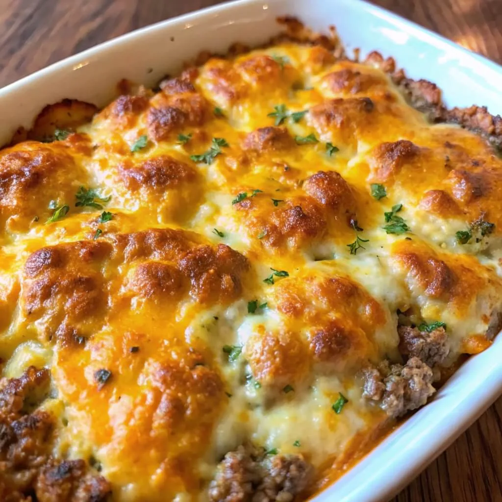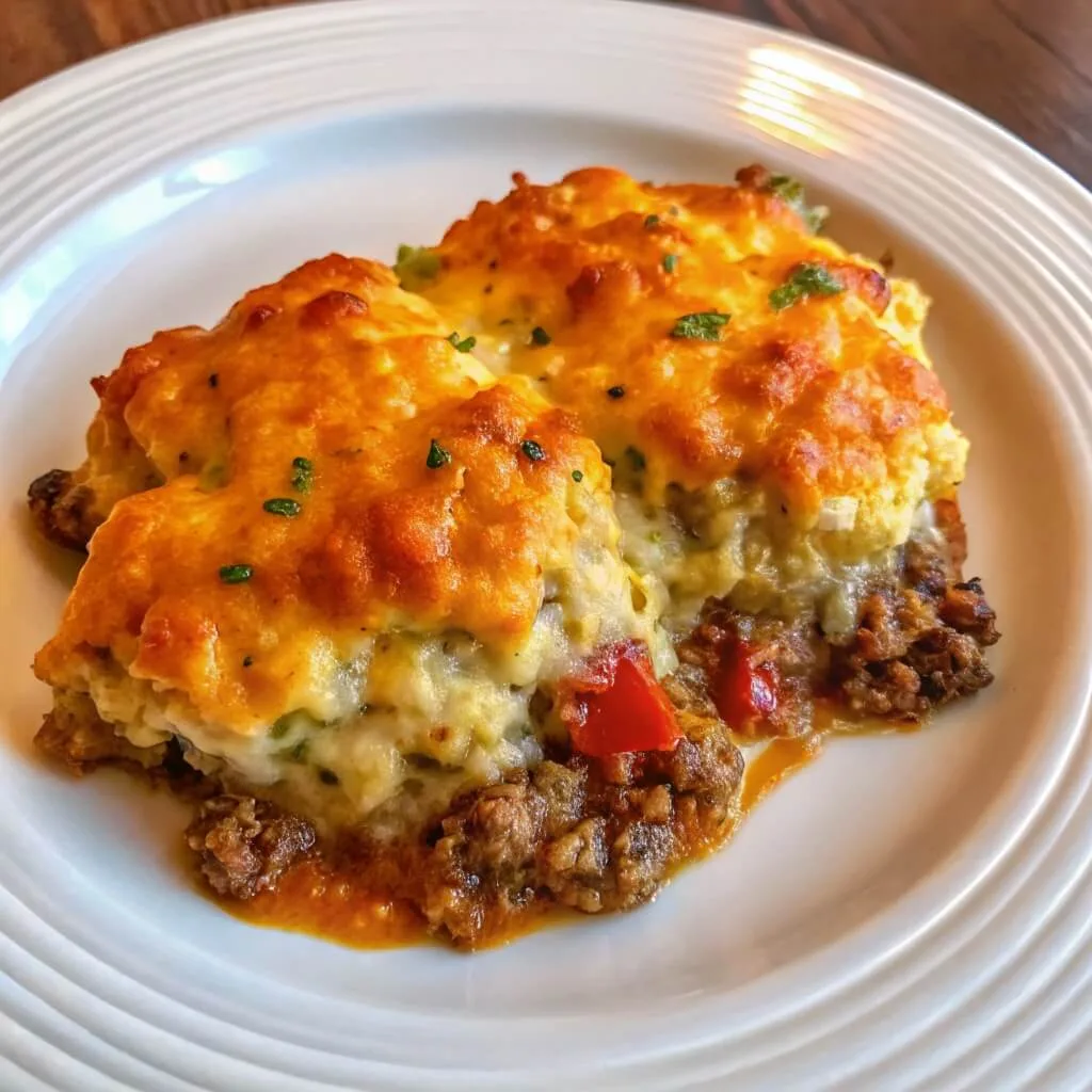 Step 8: The Garlic Butter Finish Mix your melted butter with the garlic powder. As soon as you pull the casserole out of the oven, brush this garlicky butter over the hot, fluffy biscuits. Let the dish rest for 5 minutes before slicing—this helps the sauce set up so you get clean, beautiful portions.