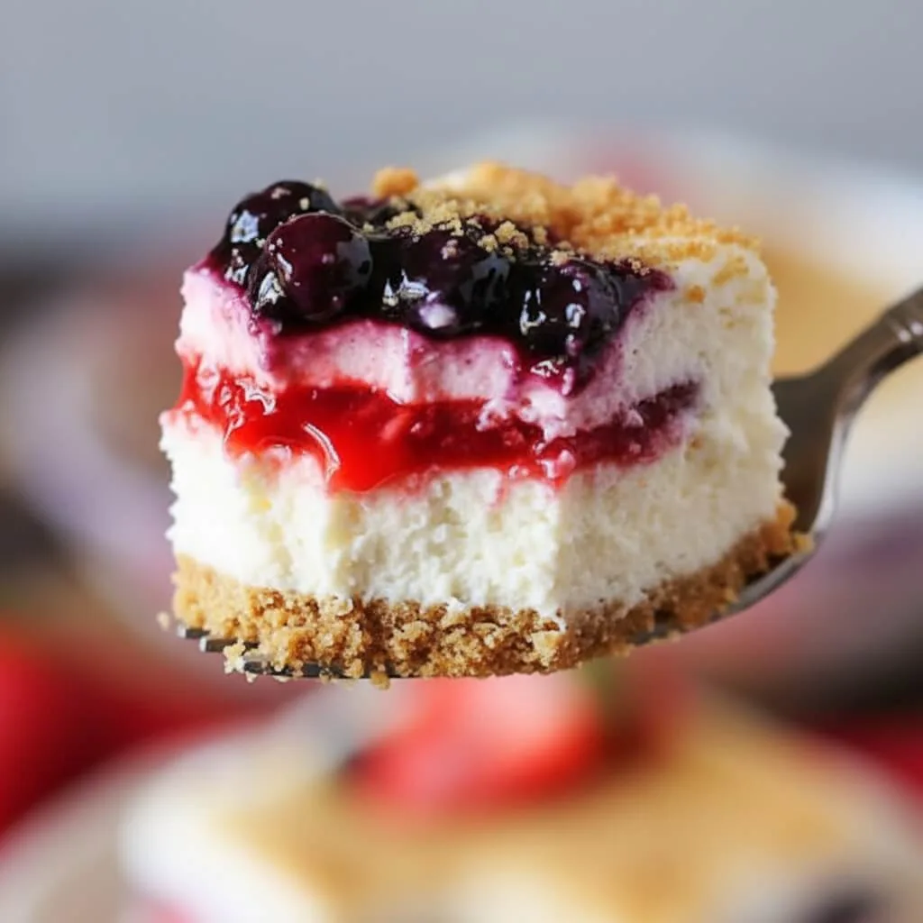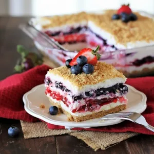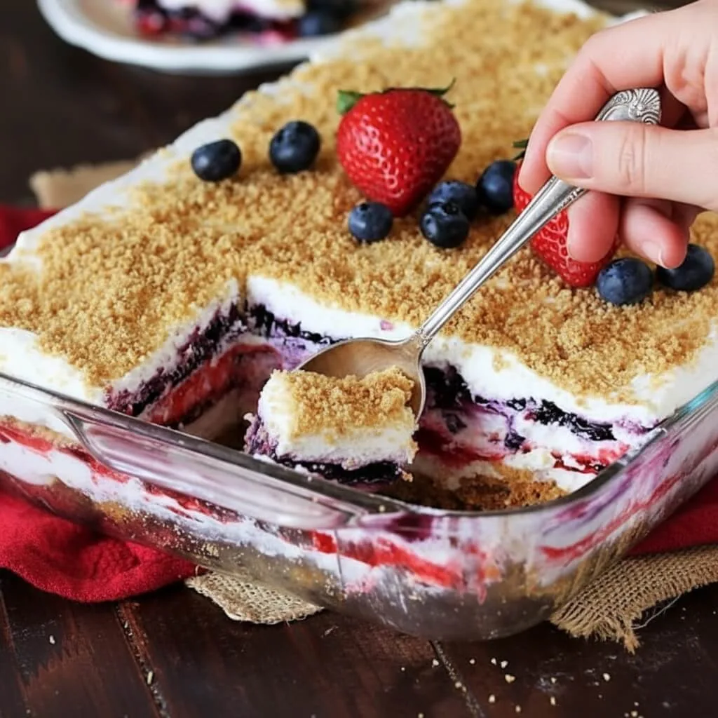 A festive, layered no-bake dessert featuring a graham cracker crust, fluffy cream cheese filling, and sweet strawberry and blueberry layers. Perfect for summer holidays!